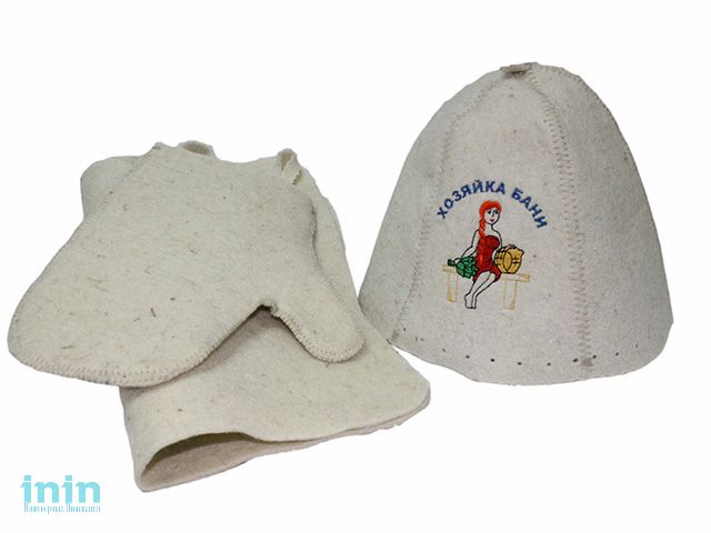 Набор для бани из 3-х предм. Шапка "Хозяйка бани", коврик, рукавичка ТМ "Бацькина баня" из войлока (БАЦЬКИНА БАНЯ)