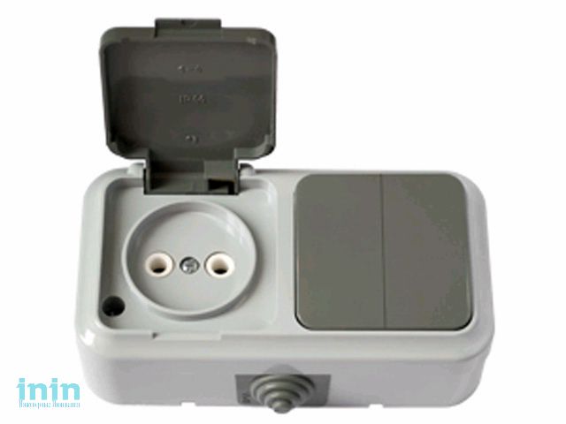 Блок выкл. 2 клав. + розетка (открытая, б/з, брызг. защ.) серая, Пралеска Аква, Bylectrica (Гарантийный срок:24 месяца)