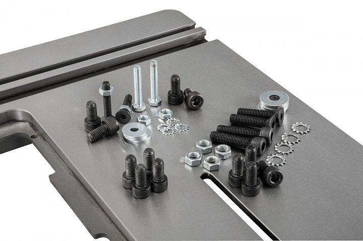 В поверхности предусмотрено два Т-образных паза шириной 8 и 19 мм для работы со скользящим угловым упором (арт. 60630T) или другой вспомогательной оснасткой. Две прорези, сбоку от отверстия под вставку, служат для крепления фрезерного упора (опция арт. 98800FJ).