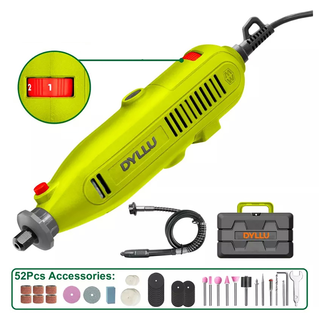 Комплектация: Гибкий вал; набор аксессуаров - 52 шт.; кейс