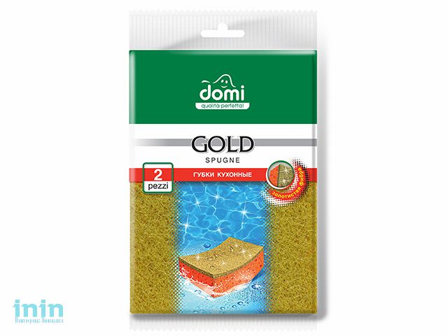 Губки кухонные золото 2 шт DOMI (Состав: поролон-оранжевый, фибра- золотистая. Размер губки: 100х67х37мм)