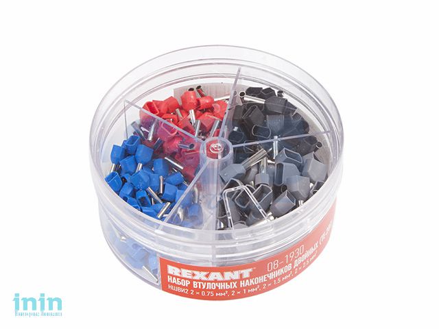 Набор втулочных наконечников двойных  НШВИ2  (2х0.75 мм2; 2х1 мм2; 2х1.5 мм2; 2х2.5 мм2)  в боксе  (ТE-200) REXANT предназначен для создания быстрого и качественного подключения различного электрооборудования и монтажа электросетей. Такой современный способ подготовки кабеля к соединению заменяет процесс облуживания или скрутки многожильных медных проводов, формируя целостное окончание кабеля с последующим подключением промышленного или бытового электрооборудования.