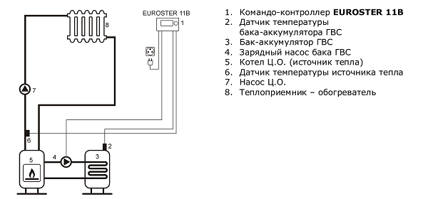 Euroster 11B это электронный контроллер зарядного насоса бойлера ГВС. Предназначен главным образом для систем с твердотопливным котлом и бойлером ГВС.