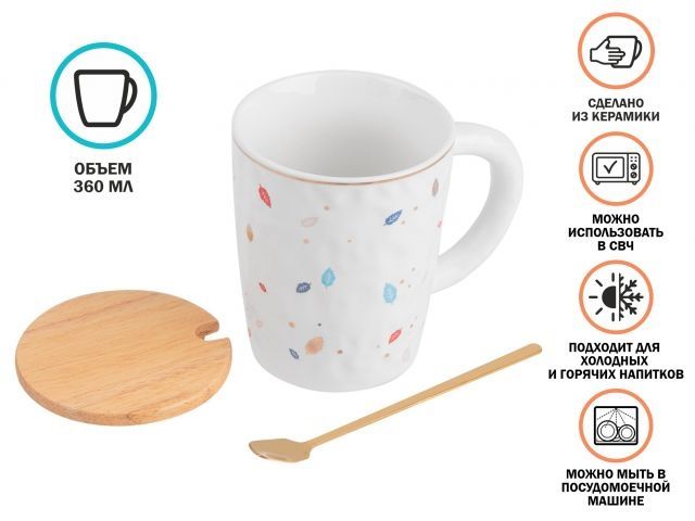 Керамическая кружка станет украшением вашего интерьера, поднимет настроение во время чаепития, семейных и дружеских встреч. Удобная рукоятка позволит крепко держать кружку и не обжигать руки, если напиток будет горячим. В набор входит ложечка из нержавеющей стали золотого цвета и деревянная крышка с резинкой по краю. Стильная кружка выручит вас в любой праздник и станет отличным подарком для любимого человека!