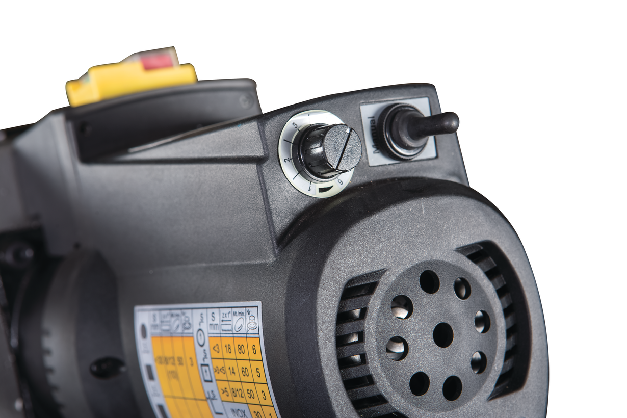 Модель оснащена экономичным электродвигателем мощностью 1,5 кВт. Станок имеет плавную регулировку скорости движения полотна, обеспечиваемую работой частотного преобразователя. Устройство позволяет изменять движения ленточного полотна в диапазоне 30-80 м/мин. Качество распила обеспечивается направляющими, регулирующие проход полотна. Направляющие свободно передвигаются по раме в зависимости от диаметра заготовки, уменьшает уводку полотна. Точность распила обеспечивается наличием в конструкции подшипников, установленных в направляющих и обеспечивающих позиционирование ленточного полотна строго в вертикальном положении, относительно заготовки. Натяжение ленточного полотна регулируется маховиком, ручным способом.