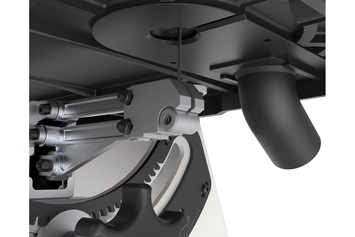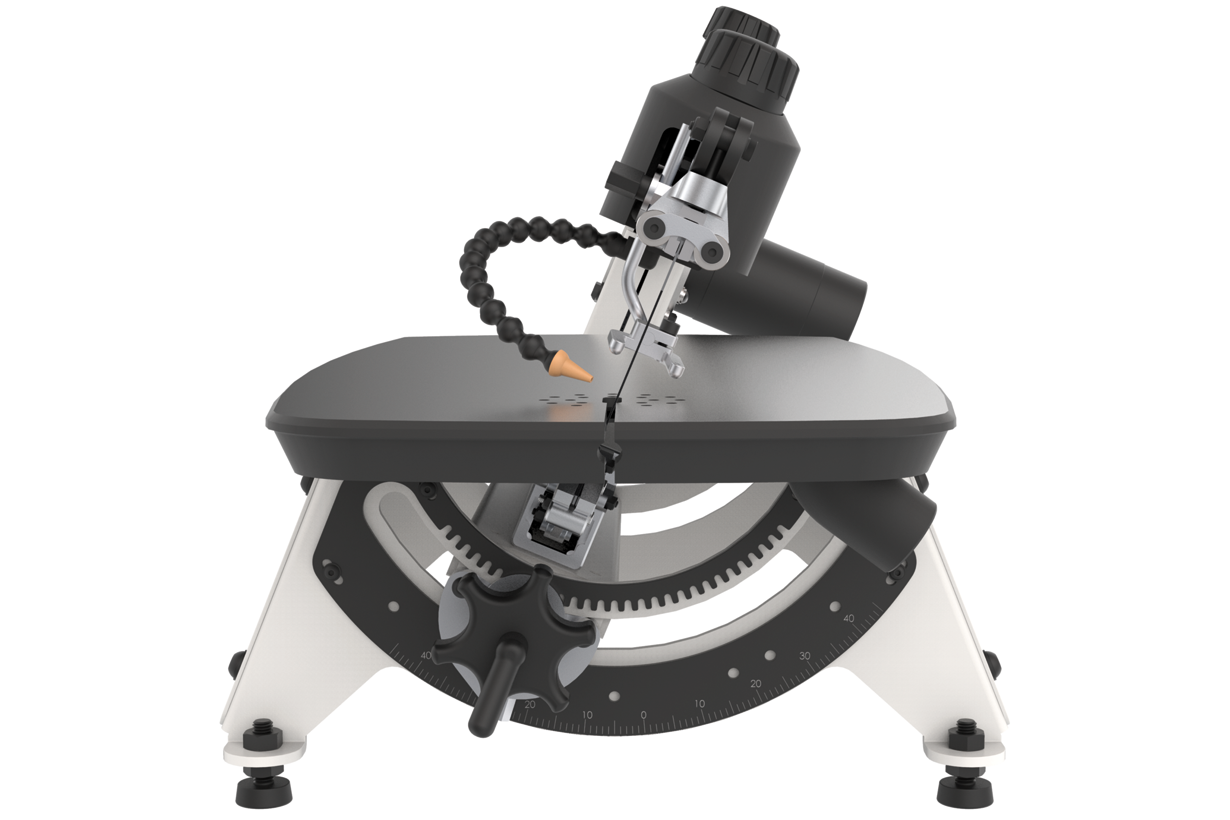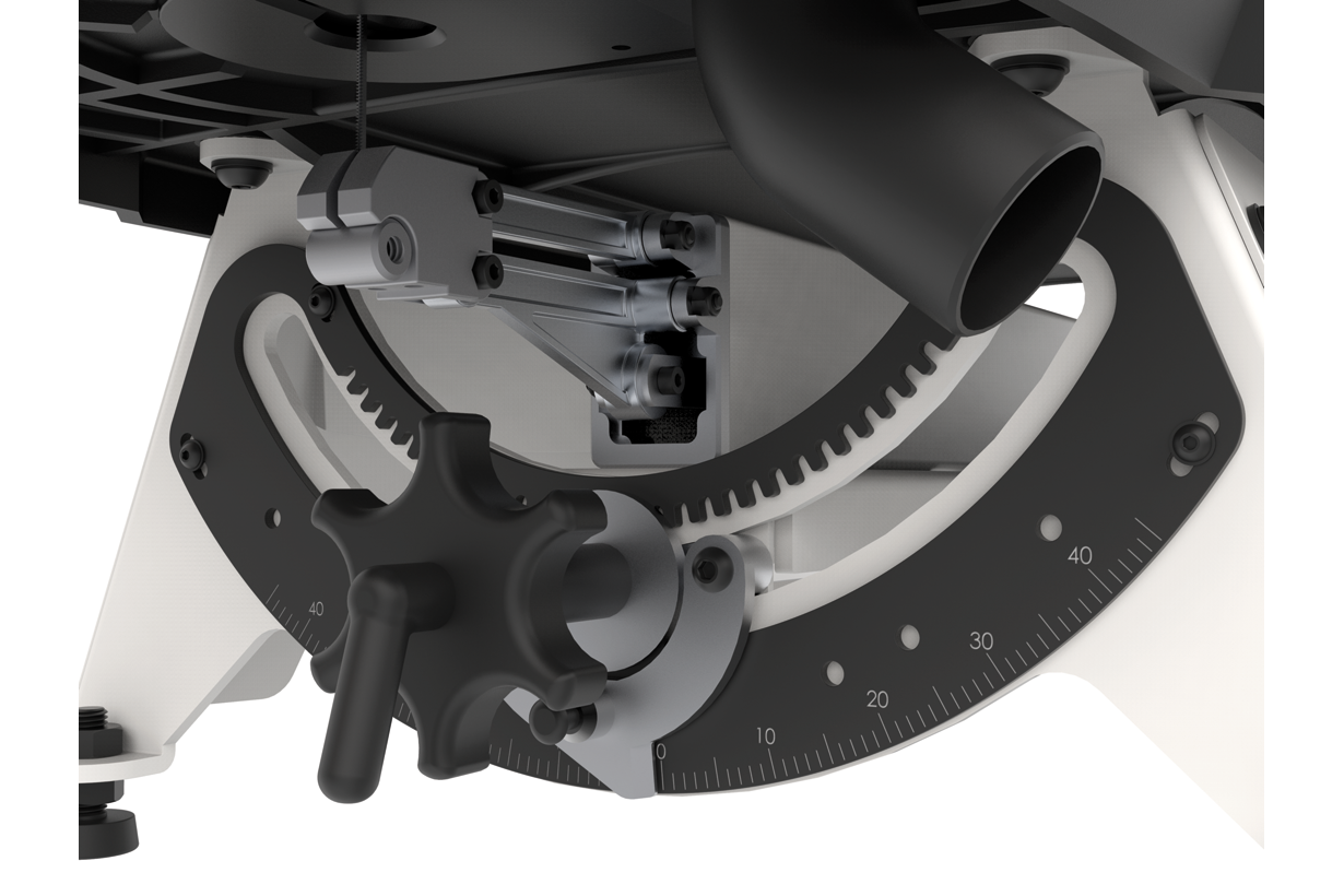 Чугунный стол жестко закреплен на основании и обеспечивает точную работу без вибраций. Для выполнения распилов под углом к поверхности наклоняют «раму» с натянутым пильным полотном. Заготовка всегда остается в горизонтальной плоскости. Регулировка наклона производится зубчатым механизмом с приводом от вращающейся рукоятки. Он симметричен и обеспечивает поворот как влево, так и вправо.