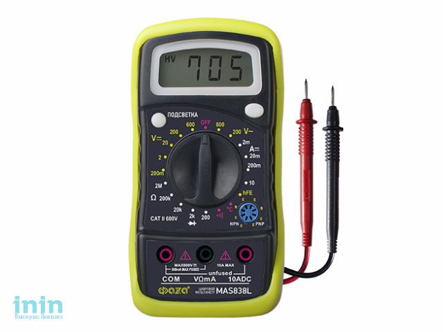 Все мультиметры серии MAS83 комплектуются защитным чехлом, который можно использовать как подставку, позволяющую установить прибор под углом. Мультиметры этой серии обладают функцией фиксации последних результатов измерений (HOLD). Постоянное напряжение 0.2/2/20/200/600 В Переменное напряжение 200/600 В Постоянный ток 2 мА/20 мА/200 мА/10 А Сопротивление 200 Ом/2 кОм/20 кОм/200 кОм/2 МОм Источник питания 9В (<Крона>) Габариты, мм 145 х 76 х 39 Вес, г 208 Упаковка 50 Функции: Измерение постоянного напряжения Измерение переменного напряжения Измерение постоянного тока Измерениесопротивления Диодный тест Транзисторный тест <Прозвонка> соединений Измерение частоты Подсветка дисплея В комплекте измерительные щупы, защитный чехол с подставкой. гарантия 1 год