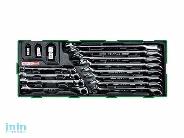 Ложемент TOPTUL набор ключей комбинированных с трещоткой и принадлежностями 15 пр. GTA1541 - изготовлен из высококачественных инструментальных материалов, что обеспечит надежность и долговечность инструмента в ходе эксплуатации.