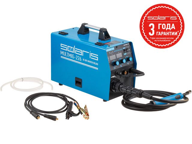 Инверторный сварочный аппарат, позволяющий варить в режиме полуавтоматической MIG/MAG/FLUX и в режиме ручной дуговой (ММА) сварки. Аппарат оснащен евроразъемом для горелки, возможностью смены полярности для сварки проволокой без газа (FLUX). Аппарат построен с использованием IGBT-транзисторов, обладает набором функций HOT START, ANTISTICK; имеет защиту от перегрева, перегрузки.