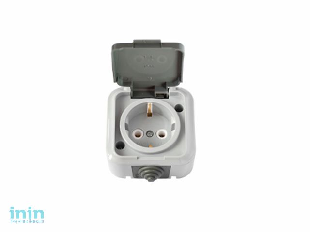 Розетка 1-ая (открытая, с/з, брызг. защ.) серая, Пралеска Аква, Bylectrica (Розетка РА16-297(03) штепсельная с заземляющим контактом брызгозащищен