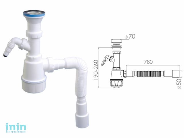 Сифон для кухни с выпуском 70мм, с отводом для стиральной машины, с гибкой трубой 1 1/2" - 40/50м (NOVA)