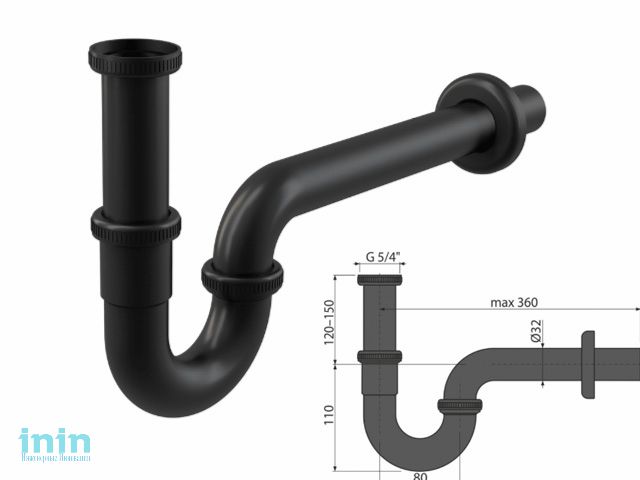 Сифон для умывальника D32, U-форма, цельнометаллический, с накидной гайкой 5/4,черный мат, Alcaplast