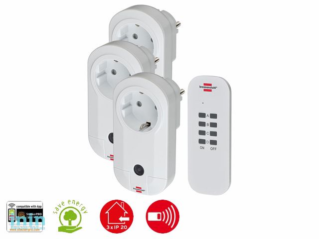 Комплект поставки: 1 пульт дистанционного управления на 3 беспроводных розетки;  3 беспроводные розетки с IP20