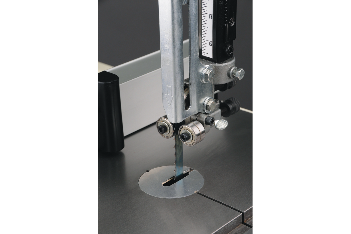 Поскольку данный станок привлекает своей универсальностью, нелишним выглядит двухскоростной редуктор, позволяющий изменять скорость ленты простой переустановкой ремня. Остальное оснащение вполне стандартно для профессиональных моделей: есть механизм для регулировки натяжения пильного полотна с индикатором усилия и рычагом для быстрого ослабления при хранении. Направляющие роликовые, рабочий стол выполнен из чугуна и может наклоняться в обе стороны (в одну на 10°, в другую на 45°).