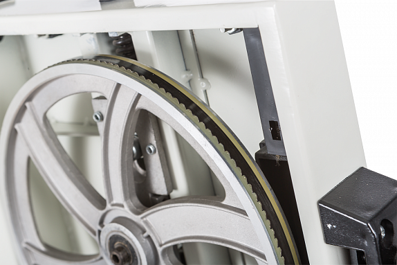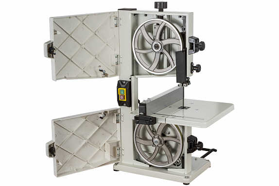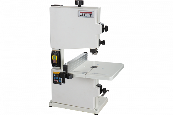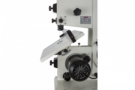Jet JWBS-8-M компактный ленточнопильный станок для хобби и эпизодических работ по дому, гаражу или хозяйству. Его устройство очень рационально, что позволило реализовать все стандартные функции ленточной пилы, не усложняя конструкцию. Ведущий шкив диаметром 210 мм установлен прямо на вал двигателя: он делает 1420 оборотов в минуту и понижающий редуктор не требуется. Направляющие полотна изготовлены в виде цилиндрических штифтов, которые удерживают ленту своими торцами. По мере износа или при замене ленты их регулируют, сдвигая вдоль оси и зажимая винтами с шестигранником. Продольную опору обеспечивает ролик с шарикоподшипником. Весь верхний узел опускается и поднимается в зависимости от толщины заготовки; аналогично устроенный нижний узел неподвижно закреплен под рабочим столом.