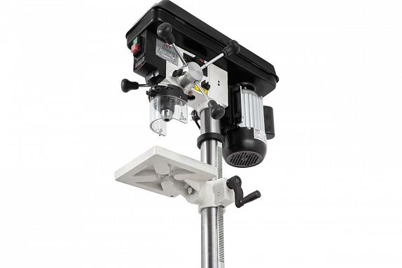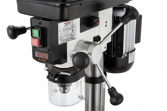 JWDP-10 это настольный сверлильный станок с вариатором для работы в небольших мастерских с деревом, металлом и другими материалами. Его конструкция базируется на узлах и деталях профессиональной модели JWDP-12, но имеет ряд отличий: уменьшены общие размеры, изменено устройство стола, использован ключевой патрон и т.п. Эти меры позволили снизить стоимость при сохранении основных достоинств: частота вращения шпинделя меняется простым перемещением рычага управления, установленная скорость отображается на цифровом дисплее, штатная комплектация включает в себя лазерный указатель оси сверления, рабочий стол имеет Т-образные пазы для крепления тисков и прихватов, предусмотрена работа от основания.