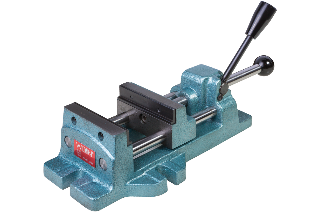 Тиски станочные, модель 1203, представляют собой один из основных элементов универсальной сменной оснастки, используемой для сверлильных работ на станочном оборудовании. Приспособление изготовлено из прочного, литейного чугуна, имеет устойчивое основание. Вес приспособления составляет 4 кг. Тиски станочные оснащены эксцентриками, позволяющие осуществлять быстрый прижим заготовки простым нажатием рычагами управления. Сила прижимного действия составляет 200-500 кг. Тиски имеют прижимные губки шириной 75 и высотой 30 мм., создавая широкую зону прихвата, позволяют осуществлять сквозное сверление. Рабочий ход приспособления 75 мм.