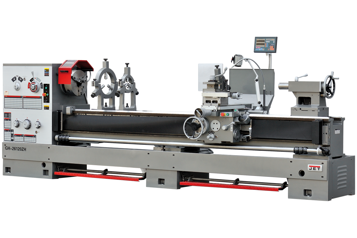 GH-26120ZH DRO самый массивный токарно-винторезный станок в линейке GH-26 производства компании JET. В этой модели расстояние  между центрами составляет 3050 мм, что позволяет обтачивать длинномерные заготовки с высокой скоростью и качеством. Диаметр обработки над станиной составляет 660 мм, при снятом мостике gap – 880 мм. Как и положено оборудованию топ-класса, GH-26120 ZH DRO поставляется в богатой комплектации: система подачи СОЖ, УЦИ, два люнета, планшайба, 4-х кулачковый патрон, переходная втулка, вращающийся и не вращающийся центры, опоры для выставки станка, набор инструмента для обслуживания, лампа освещения – все это покупатель получает «из коробки».