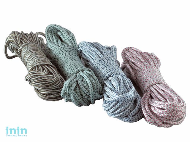 Веревка бельевая плетеная. Применяется в хозяйственных нуждах, садово-огородных работах и прочее. Не тонет, устойчива к воздействию атмосферных явлений, имеет слабую растяжимость, хорошо держит узел.