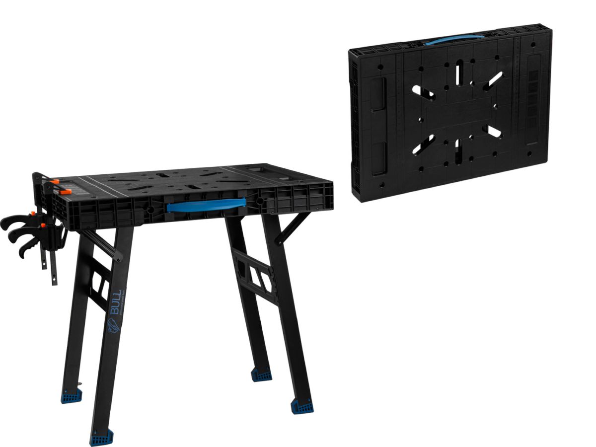 Верстак предназначен для выполнения столярных, слесарных, монтажно-сборочных и других работ. Обладает высокой грузоподъемностью, а также за счет наличия дополнительных отверстий на столешнице, подходит для работы с пистолетными струбцинами. Одним из главных преимуществ является быстроскладываемая конструкция: чтобы привести верстак в рабочее состояние понадобится не более 30 секунд. Данная модель верстака обладает специальной ручкой для переноски.